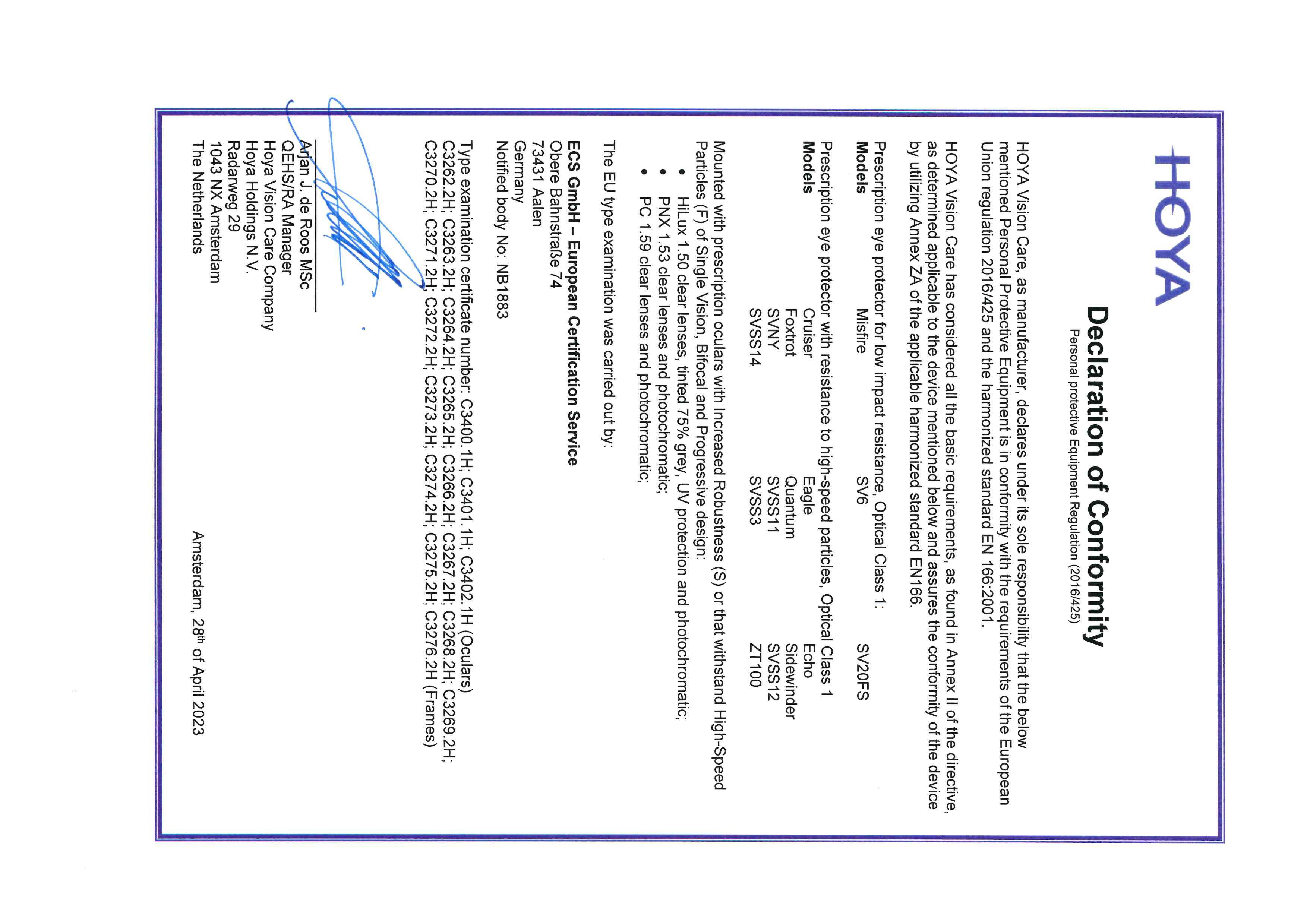 A Hoya által adott tanúsítvány igazolja, hogy a kész szemüveg egyben felel meg a szabványnak.